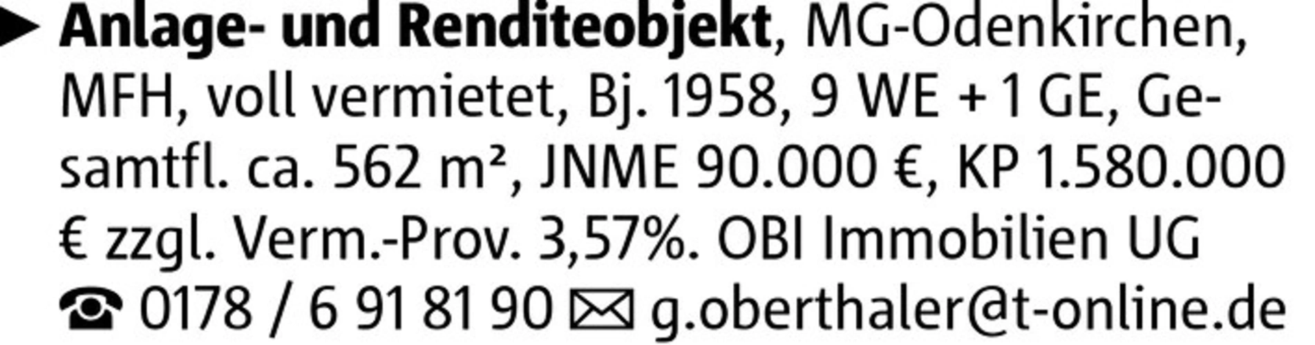 Anlage- und Renditeobjekt, MG-Odenkirchen, MFH, voll vermietet, Bj. 1958, 9 WE + 1 GE, Gesamtfl. ca. 562 m², JNME 90.000 €, KP 1.580.000 € zzgl. Verm.-Prov. 3,57%. OBI Immobilien UG 0178 / 6 91 81 90 g.oberthaler@t-online.de