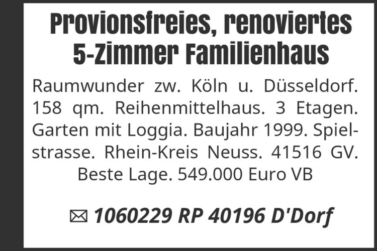 Provionsfreies, renoviertes 5-Zimmer Familienhaus Raumwunder zw. Köln u. Düsseldorf. 158 qm. Reihenmittelhaus. 3 Etagen. Garten mit Loggia. Baujahr 1999. Spielstrasse. Rhein-Kreis Neuss. 41516 GV. Beste Lage. 549.000 Euro VB 1060229 RP 40196 D'Dorf