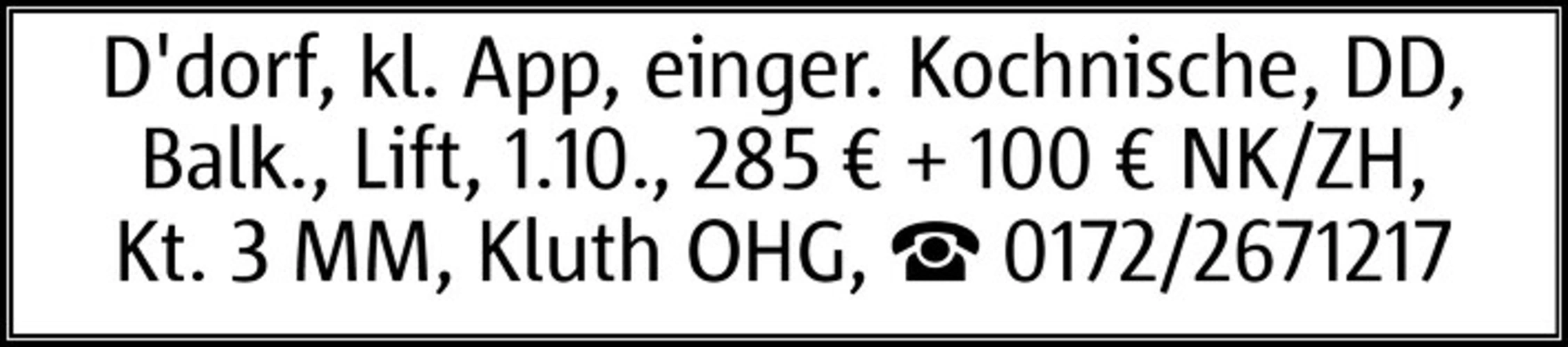 D'dorf, kl. App, einger. Kochnische, DD, Balk., Lift, 1.10., 285 € + 100 € NK/ZH, Kt. 3 MM, Kluth OHG, 0172/2671217
