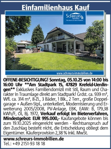 Einfamilienhaus Kauf OFFENE-BESICHTIGUNG! Sonntag, 05.10.25 von 14:00 bis 16:00 Uhr Am Stadtpark 15, 47829 Krefeld-Uerdingen Exklusives Familiendomizil mit Stil, Raum und Charakter in Traumlage direkt am Stadtpark! Grdst. ca. 939 m², Wfl. ca. 314 m², 8-Zi., 3 Bäder, 1 Blk., 2 Terr., große Doppelgarage + Außen-Stpl., unterkellert, Modernisierung und Erweiterung 2005/2008, PV-Anlage, EBK, EAW: B, 179,38 kWh/F, Öl, Bj. 1972, Verkauf erfolgt im Bieterverfahren, Mindestgebot: EUR 995.000,- Kaufangebote können bis zum 19.10.2025 eingereicht werden - Rechtsanspruch auf den Zuschlag besteht nicht, die Entscheidung obliegt dem Eigentümer. Käuferprovision 2,38 % inkl. MwSt. www.schreurs-immobilien.de Tel.: +49 2151-93 18 18