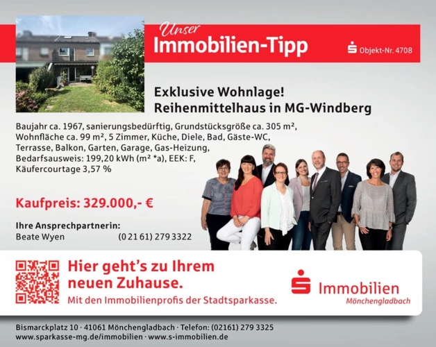Unser Immobilien-Tipp Objekt-Nr. 4708 Exklusive Wohnlage! Reihenmittelhaus in MG-Windberg Baujahr ca. 1967, sanierungsbedürftig, Grundstücksgröße ca. 305 m², Wohnfläche ca. 99 m², 5 Zimmer, Küche, Diele, Bad, Gäste-WC, Terrasse, Balkon, Garten, Garage, Gas-Heizung, Bedarfsausweis: 199,20 kWh (m² *a), EEK: F, Käufercourtage 3,57 % Kaufpreis: 329.000,- € Ihre Ansprechpartnerin: Beate Wyen (0 21 61) 279 3322 Hier geht´s zu Ihrem neuen Zuhause. Mit den Immobilienpros der Stadtsparkasse. Bismarckplatz 10 · 41061 Mönchengladbach · Telefon: (02161) 279 3325 www.sparkasse-mg.de/immobilien · www.s-immobilien.de Immobilien Mönchengladbach