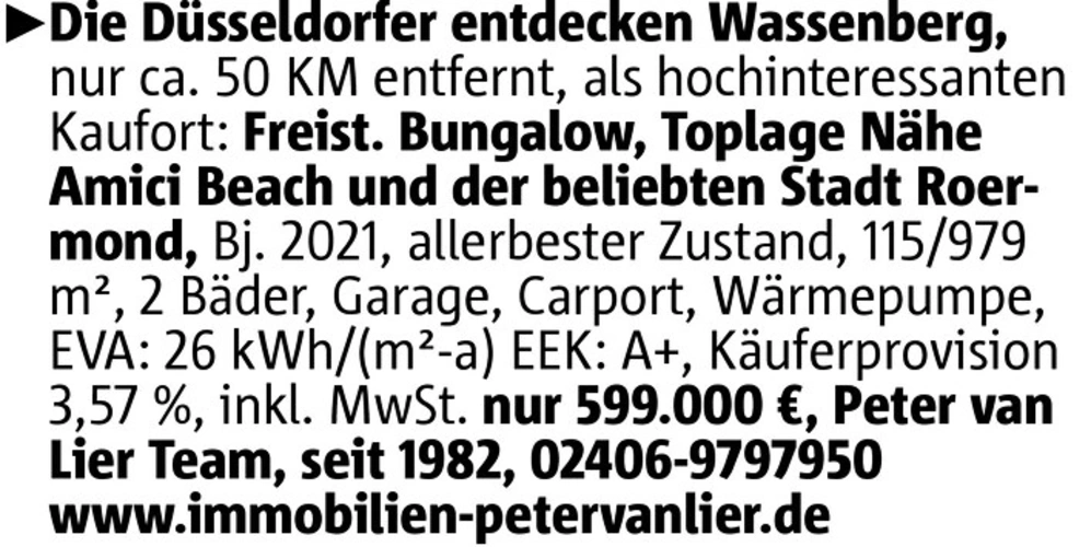Die Düsseldorfer entdecken Wassenberg, nur ca. 50 KM entfernt, als hochinteressanten Kaufort: Freist. Bungalow, Toplage Nähe Amici Beach und der beliebten Stadt Roermond, Bj. 2021, allerbester Zustand, 115/979 m², 2 Bäder, Garage, Carport, Wärmepumpe, EVA: 26 kWh/(m²-a) EEK: A+, Käuferprovision 3,57 %, inkl. MwSt. nur 599.000 €, Peter van Lier Team, seit 1982, 02406-9797950 www.immobilien-petervanlier.de
