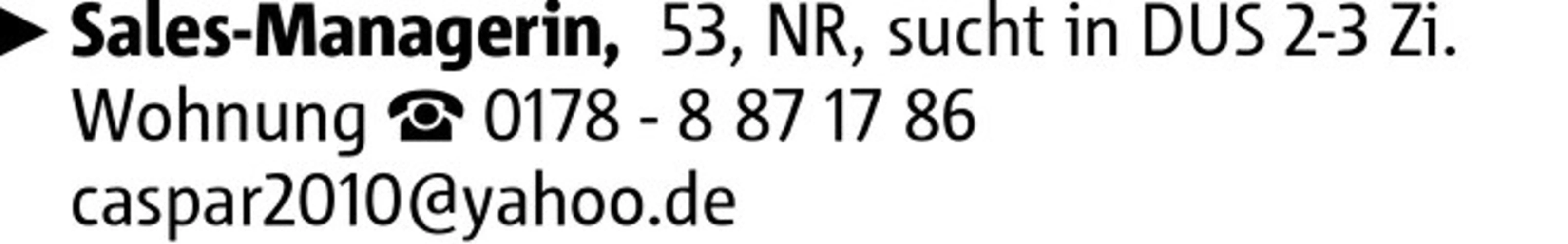 Sales-Managerin, 53, NR, sucht in DUS 2-3 Zi. Wohnung 0178 - 8 87 17 86 caspar2010@yahoo.de