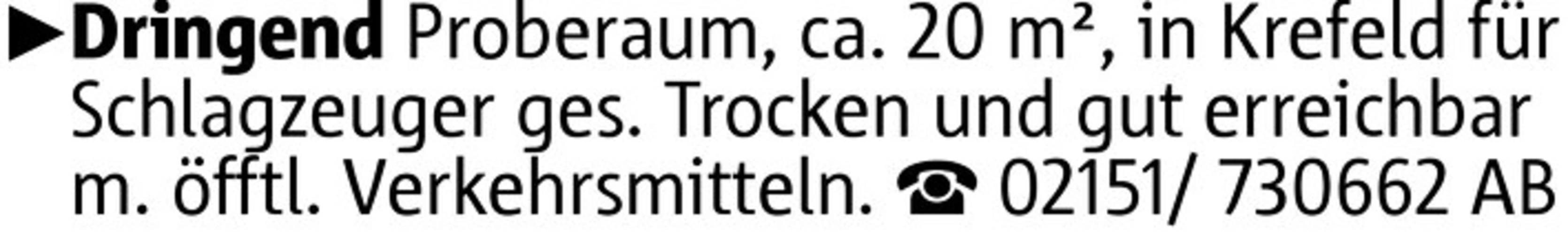 Dringend Proberaum, ca. 20 m², in Krefeld für Schlagzeuger ges. Trocken und gut erreichbar m. öfftl. Verkehrsmitteln. 02151/ 730662 AB