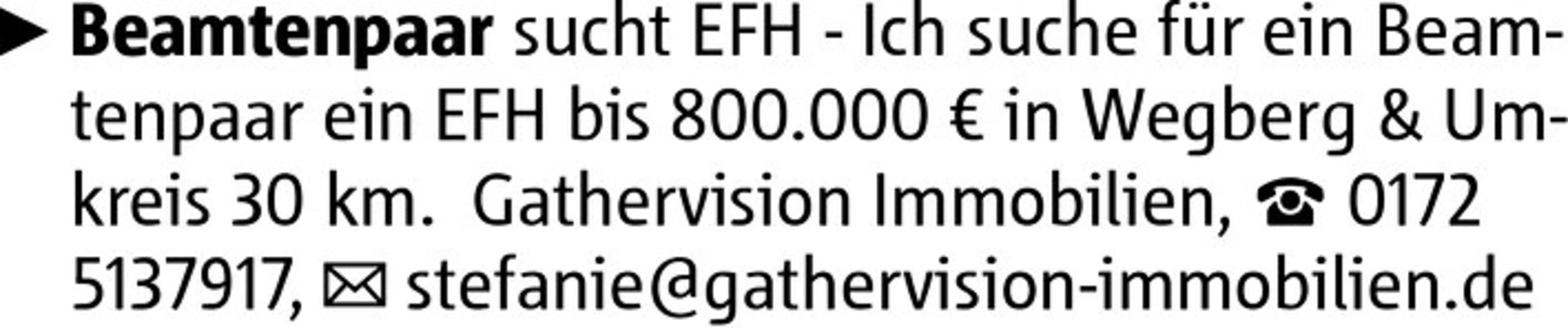 Beamtenpaar sucht EFH - Ich suche für ein Beamtenpaar ein EFH bis 800.000 € in Wegberg & Umkreis 30 km. Gathervision Immobilien, 0172 5137917, stefanie@gathervision-immobilien.de
