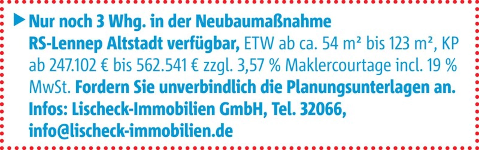 Nur noch 3 Whg. in der Neubaumaßnahme RS-Lennep Altstadt verfügbar, ETW ab ca. 54 m² bis 123 m², KP ab 247.102 [Chiffre] bis 562.541 [Chiffre] zzgl. 3,57 % Maklercourtage incl. 19 % MwSt. Fordern Sie unverbindlich die Planungsunterlagen an. Infos: Lischeck-Immobilien GmbH, Tel. 32066, info@lischeck-immobilien.de