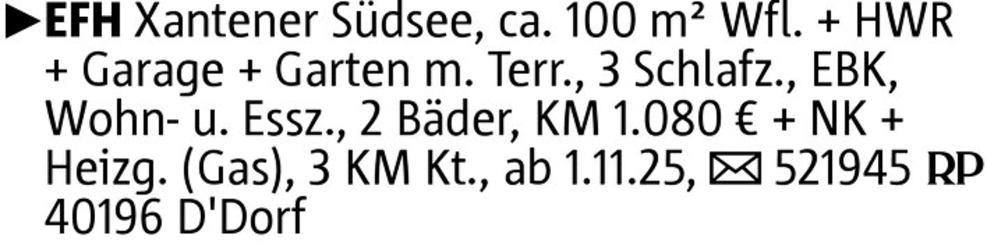 EFH Xantener Südsee, ca. 100 m² Wfl. + HWR + Garage + Garten m. Terr., 3 Schlafz., EBK, Wohn- u. Essz., 2 Bäder, KM 1.080 € + NK + Heizg. (Gas), 3 KM Kt., ab 1.11.25, 521945 40196 D'Dorf