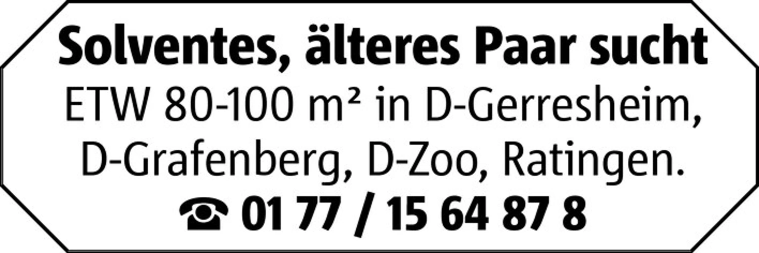 Solventes, älteres Paar sucht ETW 80-100 m² in D-Gerresheim, D-Grafenberg, D-Zoo, Ratingen. 01 77 / 15 64 87 8