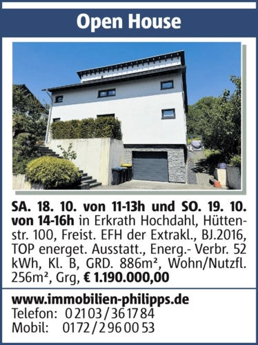 Open House SA. 18. 10. von 11-13h und SO. 19. 10. von 14-16h in Erkrath Hochdahl, Hüttenstr. 100, Freist. EFH der Extrakl., BJ.2016, TOP energet. Ausstatt., Energ.- Verbr. 52 kWh, Kl. B, GRD. 886m², Wohn/Nutzfl. 256m², Grg, € 1.190.000,00 www.immobilien-philipps.de Telefon: 0 21 03 / 36 17 84 Mobil: 01 72 / 2 96 00 53