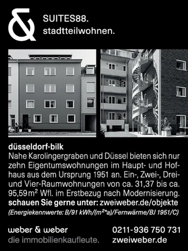 Düsseldorf-Bilk, Nahe Karolingergraben und Düssel bieten sich nur zehn Eigentumswohnungen im Haupt- und Hofhaus aus dem Ursprung 1951 an. Ein-, Zwei-, Drei- und Vier-Raumwohnungen von ca. 31,37 bis ca. 95,59 m² Wfl. im Erstbezug nach Modernisierung. Schauen Sie gerne unter: zweiweber.de/objekte (Energiekennwerte: B/91 kWh/(m²*a)/Färnwärme/BJ 1951/C) weber & weber Die Immobilienkaufleute. 0211-936 750 731 zweiweber.de