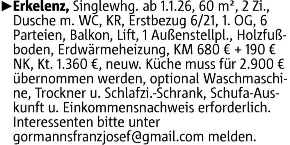 Erkelenz, Singlewhg. ab 1.1.26, 60 m², 2 Zi., Dusche m. WC, KR, Erstbezug 6/21, 1. OG, 6 Parteien, Balkon, Lift, 1 Außenstellpl., Holzfußboden, Erdwärmeheizung, KM 680 € + 190 € NK, Kt. 1.360 €, neuw. Küche muss für 2.900 € übernommen werden, optional Waschmaschine, Trockner u. Schlafzi.-Schrank, Schufa-Auskunft u. Einkommensnachweis erforderlich. Interessenten bitte unter gormannsfranzjosef@gmail.com melden.