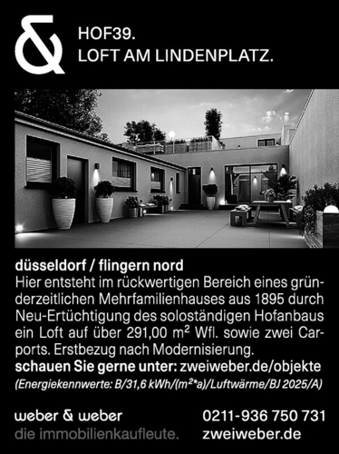 Düsseldorf / Flingern Nord. Hier entsteht im rückwertigen Bereich eines gründerzeitlichen Mehrfamilienhauses aus 1895 durch Neu-Ertüchtigung des soloständigen Hofanbaus ein Loft auf über 291,00 m² Wfl. sowie zwei Carports. Erstbezug nach Modernisierung. Schauen Sie gerne unter: zweiweber.de/objekte. (Energiekennwerte: B/31,6 kWh/(m²*a)/Luftwärme/BJ 2025/A) weber & weber Die Immobilienkaufleute. 0211-936 750 731 zweiweber.de