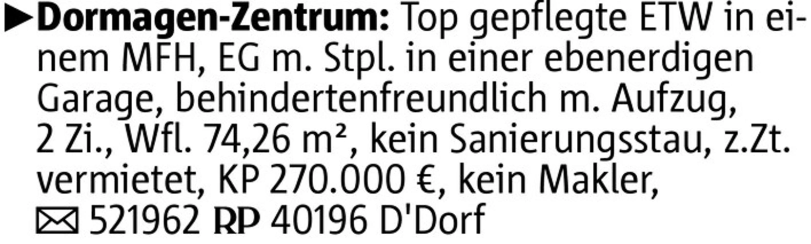 Dormagen-Zentrum: Top gepflegte ETW in einem MFH, EG m. Stpl. in einer ebenerdigen Garage, behindertenfreundlich m. Aufzug, 2 Zi., Wfl. 74,26 m², kein Sanierungsstau, z.Zt. vermietet, KP 270.000 €, kein Makler, 521962 40196 D'Dorf