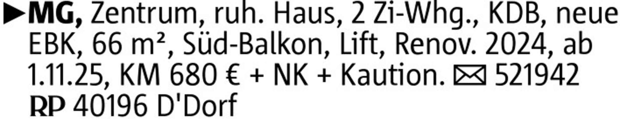 MG, Zentrum, ruh. Haus, 2 Zi-Whg., KDB, neue EBK, 66 m², Süd-Balkon, Lift, Renov. 2024, ab 1.11.25, KM 680 € + NK + Kaution. 521942 40196 D'Dorf