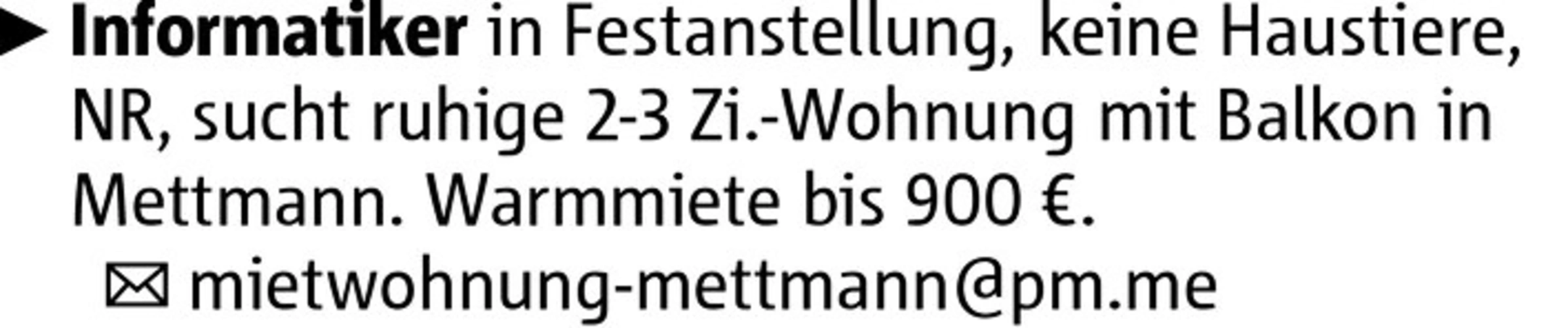 Informatiker in Festanstellung, keine Haustiere, NR, sucht ruhige 2-3 Zi.-Wohnung mit Balkon in Mettmann. Warmmiete bis 900 €. mietwohnung-mettmann@pm.me