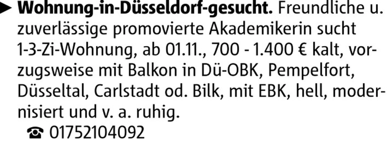 Wohnung-in-Düsseldorf-gesucht. Freundliche u. zuverlässige promovierte Akademikerin sucht 1-3-Zi-Wohnung, ab 01.11., 700 - 1.400 € kalt, vorzugsweise mit Balkon in Dü-OBK, Pempelfort, Düsseltal, Carlstadt od. Bilk, mit EBK, hell, modernisiert und v. a. ruhig. 01752104092