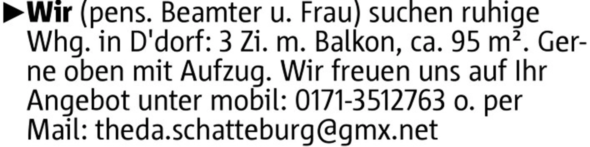 Wir (pens. Beamter u. Frau) suchen ruhige Whg. in D'dorf: 3 Zi. m. Balkon, ca. 95 m². Gerne oben mit Aufzug. Wir freuen uns auf Ihr Angebot unter mobil: 0171-3512763 o. per Mail: theda.schatteburg@gmx.net