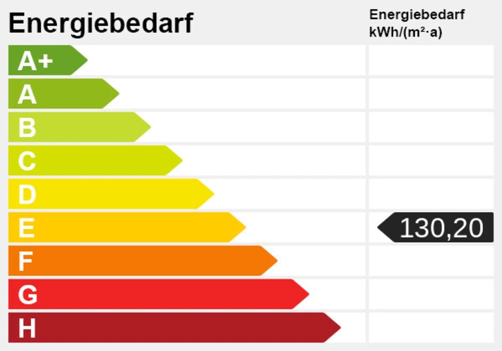 Es liegt ein Energiebedarfsausweis vor. Dieser ist gültig bis 4.3.2035. Endenergiebedarf beträgt 130.20 kwh/(m²*a). Wesentlicher Energieträger der Heizung ist Gas. Das Baujahr des Objekts lt. Energieausweis ist 2004. Die Energieeffizienzklasse ist E.