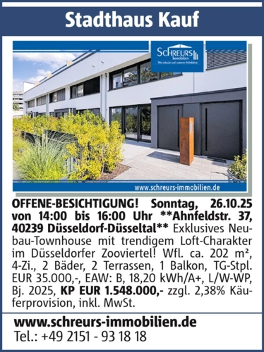 Stadthaus Kauf OFFENE-BESICHTIGUNG! Sonntag, 26.10.25 von 14:00 bis 16:00 Uhr Ahnfeldstr. 37, 40239 Düsseldorf-Düsseltal Exklusives Neubau-Townhouse mit trendigem Loft-Charakter im Düsseldorfer Zooviertel! Wfl. ca. 202 m², 4-Zi., 2 Bäder, 2 Terrassen, 1 Balkon, TG-Stpl. EUR 35.000,-, EAW: B, 18,20 kWh/A+, L/W-WP, Bj. 2025, KP EUR 1.548.000,- zzgl. 2,38% Käuferprovision, inkl. MwSt. www.schreurs-immobilien.de Tel.: +49 2151 - 93 18 18