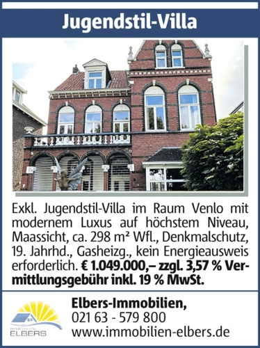 Jugendstil-Villa Exkl. Jugendstil-Villa im Raum Venlo mit modernem Luxus auf höchstem Niveau, Maassicht, ca. 298 m² Wfl., Denkmalschutz, 19. Jahrhd., Gasheizg., kein Energieausweis erforderlich. € 1.049.000,-- zzgl. 3,57 % Vermittlungsgebühr inkl. 19 % MwSt. Elbers-Immobilien, 021 63 - 579 800 www.immobilien-elbers.de