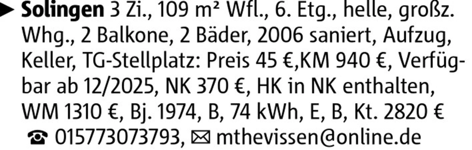Solingen 3 Zi., 109 m² Wfl., 6. Etg., helle, großz. Whg., 2 Balkone, 2 Bäder, 2006 saniert, Aufzug, Keller, TG-Stellplatz: Preis 45 €,KM 940 €, Verfügbar ab 12/2025, NK 370 €, HK in NK enthalten, WM 1310 €, Bj. 1974, B, 74 kWh, E, B, Kt. 2820 € 015773073793, mthevissen@online.de