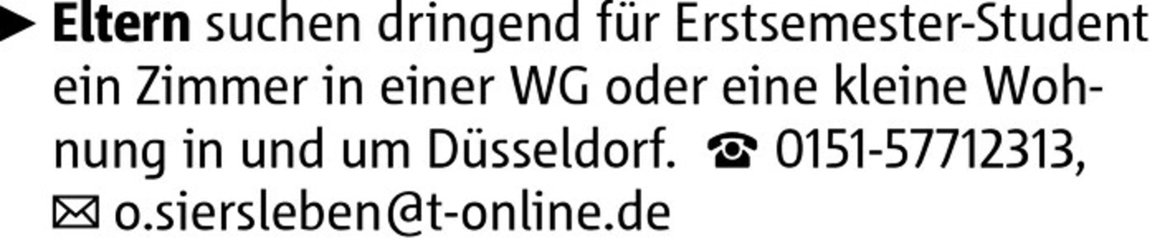 Eltern suchen dringend für Erstsemester-Student ein Zimmer in einer WG oder eine kleine Wohnung in und um Düsseldorf. 0151-57712313, o.siersleben@t-online.de