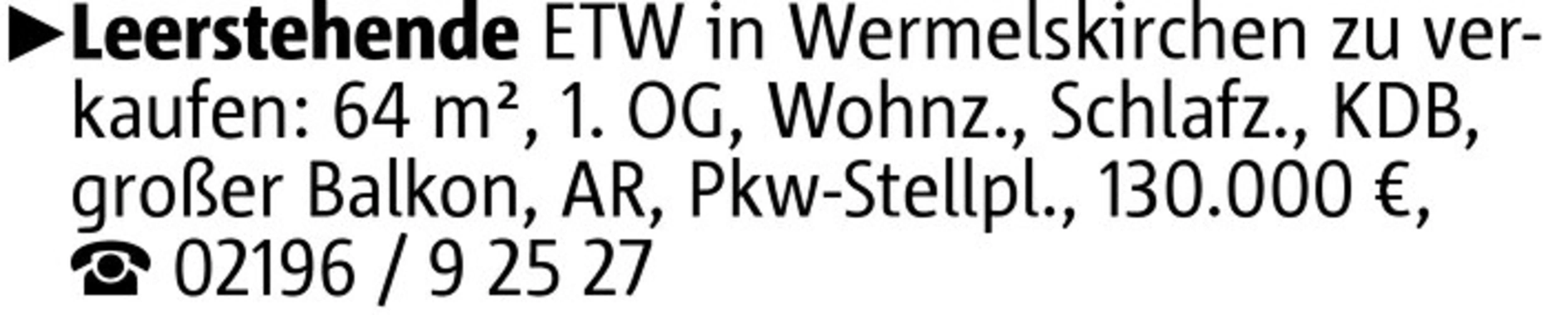 Leerstehende ETW in Wermelskirchen zu verkaufen: 64 m², 1. OG, Wohnz., Schlafz., KDB, großer Balkon, AR, Pkw-Stellpl., 130.000 €, 02196 / 9 25 27