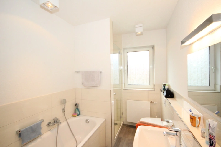 Die Immobilie erstreckt sich über drei Etagen, wobei jede Etage über eine eigene Wohnungseingangstür, eine Diele, drei Zimmer, eine Küche und ein Badezimmer verfügt. Das Badezimmer ist im Erdgeschoss mit einer Wanne, einer Dusche und einem Fenster ausgestattet und hell gefliest. Besonders im Erdgeschoss überzeugt die Küche durch den direkten Zugang zur Terrasse und zum Garten. Auch der Keller bietet einen Zugang zum Garten, in dem ein wunderschöner Amberbaum steht, der dem Außenbereich eine besondere Atmosphäre verleiht. Der Garten ist größtenteils eingezäunt, bietet viel Platz für Entspannung und Freizeitaktivitäten und wird durch ein Gartenhaus ergänzt, das zusätzlichen Stauraum schafft.