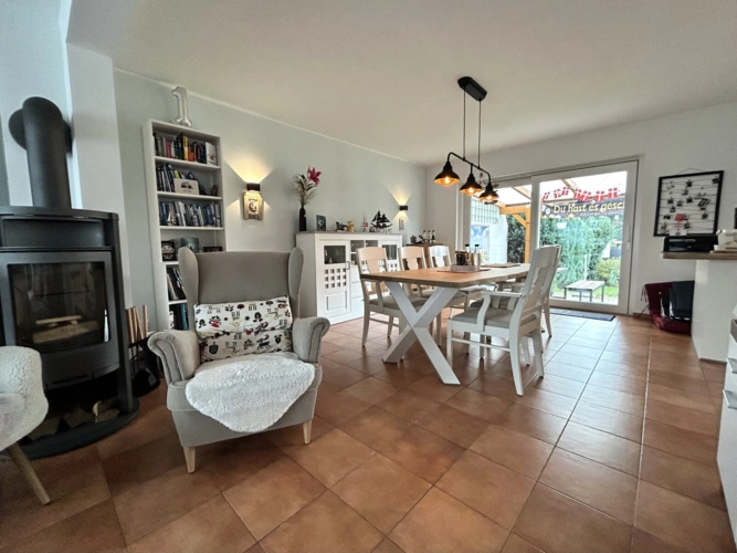 Im Erdgeschoss öffnet sich ein großzügiger Wohn- und Essbereich, in dem ein Kamin für behagliche Atmosphäre sorgt. Die halboffene Küche fügt sich harmonisch in das Raumgefüge ein und fördert das Miteinander im Alltag. Direkt angrenzend befindet sich eine funktionale Abstellkammer.