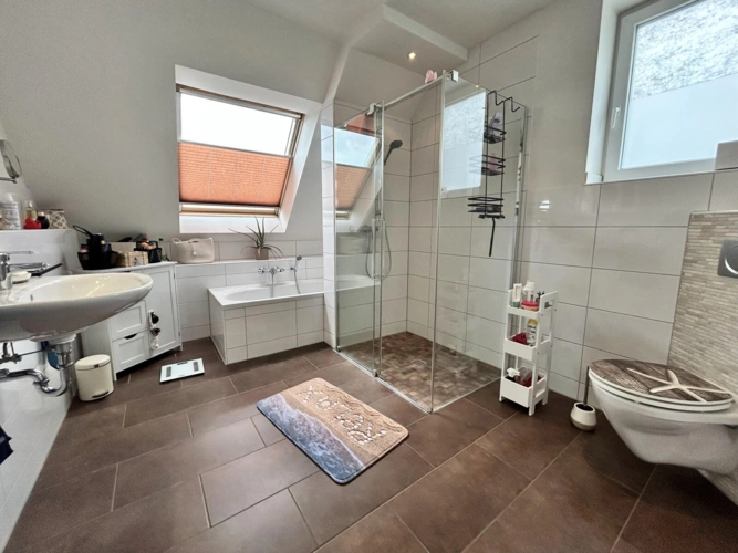 Mit einer Wohnfläche von rund 120 m², zuzüglich einer wohnlich ausgebauten Fläche im Dachgeschoss, bietet sie ein durchdachtes Raumkonzept, das sowohl für Paare als auch für Familien mit Kindern attraktiv ist.