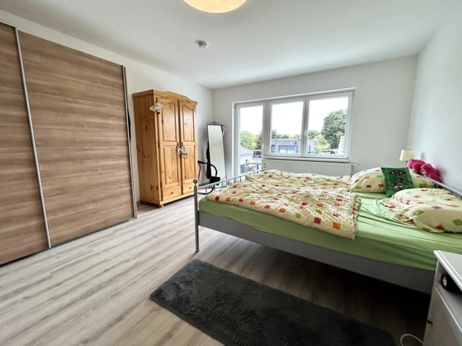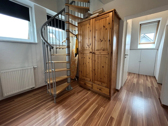 Im Obergeschoss stehen ein Schlafzimmer und ein weiteres Zimmer mit etwa 14 m² zur Verfügung, das aktuell als Arbeits- und Gästezimmer genutzt wird. Das Badezimmer überzeugt mit Dusche und Wanne, während der Flur durch maßgefertigte Einbauschränke zusätzlichen Stauraum bietet.