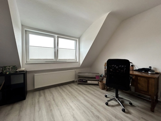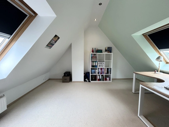 Der ausgebaute Spitzboden ist über eine Wendeltreppe erreichbar und durch große Dachflächenfenster angenehm lichtdurchflutet. Dieser Bereich eignet sich hervorragend als ruhiger Arbeitsplatz oder Rückzugsort. Ein angrenzender Raum ist bereits mit den nötigen Anschlüssen versehen, um künftig als weiteres Bad genutzt zu werden. Aktuell befindet er sich noch im Rohbau. Die Fläche des Spitzbodens ist nicht in der angegebenen Wohnfläche enthalten, bietet jedoch eine wertvolle Erweiterung.