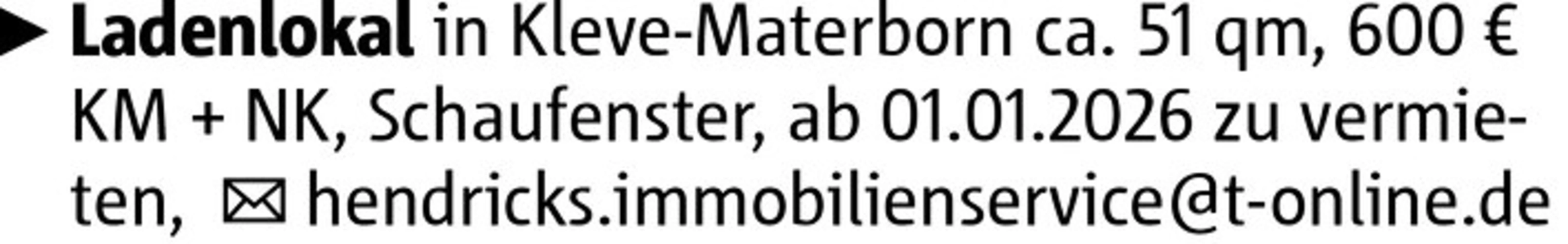 Ladenlokal in Kleve-Materborn ca. 51 qm, 600 € KM + NK, Schaufenster, ab 01.01.2026 zu vermieten, hendricks.immobilienservice@t-online.de