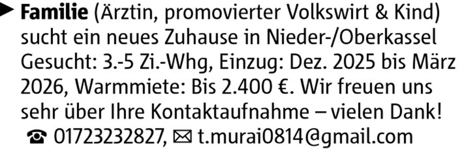 Familie (Ärztin, promovierter Volkswirt & Kind) sucht ein neues Zuhause in Nieder-/Oberkassel Gesucht: 3.-5 Zi.-Whg, Einzug: Dez. 2025 bis März 2026, Warmmiete: Bis 2.400 €. Wir freuen uns sehr über Ihre Kontaktaufnahme vielen Dank! 01723232827, t.murai0814@gmail.com