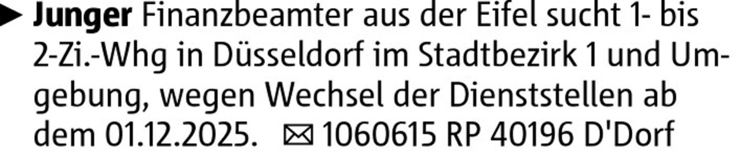 Junger Finanzbeamter aus der Eifel sucht 1- bis 2-Zi.-Whg in Düsseldorf im Stadtbezirk 1 und Umgebung, wegen Wechsel der Dienststellen ab dem 01.12.2025. 1060615 RP 40196 D'Dorf