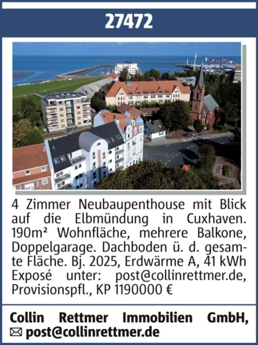27472 4 Zimmer Neubaupenthouse mit Blick auf die Elbmündung in Cuxhaven. 190m² Wohnfläche, mehrere Balkone, Doppelgarage. Dachboden ü. d. gesamte Fläche. Bj. 2025, Erdwärme A, 41 kWh Exposé unter: post@collinrettmer.de, Provisionspfl., KP 1.190.000 € Collin Rettmer Immobilien post@collinrettmer.de GmbH.