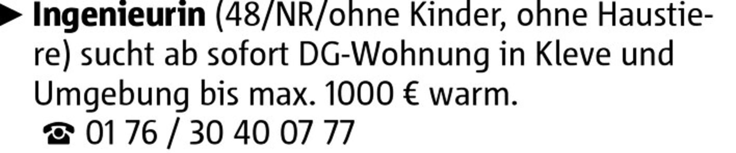 Ingenieurin (48/NR/ohne Kinder, ohne Haustiere) sucht ab sofort DG-Wohnung in Kleve und Umgebung bis max. 1000 € warm. 01 76 / 30 40 07 77