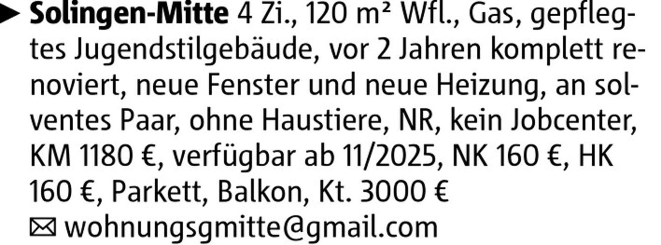 Solingen-Mitte 4 Zi., 120 m² Wfl., Gas, gepflegtes Jugendstilgebäude, vor 2 Jahren komplett renoviert, neue Fenster und neue Heizung, an solventes Paar, ohne Haustiere, NR, kein Jobcenter, KM 1180 €, verfügbar ab 11/2025, NK 160 €, HK 160 €, Parkett, Balkon, Kt. 3000 € wohnungsgmitte@gmail.com