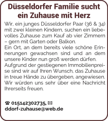 Düsseldorfer Familie sucht ein Zuhause mit Herz Wir, ein junges Düsseldorfer Paar (36 & 34) mit zwei kleinen Kindern, suchen ein liebevolles Zuhause zum Kauf ab vier Zimmern - gern mit Garten oder Balkon. Ein Ort, an dem bereits viele schöne Erinnerungen gewachsen sind und an dem unsere Kinder nun groß werden dürfen. Aufgrund der gestiegenen Immobilienpreise sind wir auf Ihren Wunsch, das Zuhause in treue Hände zu übergeben, angewiesen. Wir würden uns sehr über eine Nachricht Ihrerseits freuen. 015142302735, ddorf-zuhause@web.de
