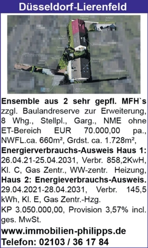 Ensemble aus 2 sehr gepfl. MFH's zzgl. Baulandreserve zur Erweiterung, 8 Whg., Stellpl., Garg., NME ohne ET-Bereich EUR 70.000,00 pa., NWFL.ca. 660m2, Grdst. ca. 1.728m2, Energierverbrauchs-Ausweis Haus 1: 26.04.21-25.04.2031, Verbr. 858,2KWH, KI. C, Gas Zentr., WW-zentr. Heizung, Haus 2: Energieverbrauchs-Ausweis. 29.04.2021-28.04.2031, Verbr. 145,5 kWh, Kl. E, Gas Zentr.-Hzg. KP 3.050.000,00, Provision 3,57% incl. ges. MwSt. www.immobilien-philipps.de Telefon: 02103 / 36 17 84