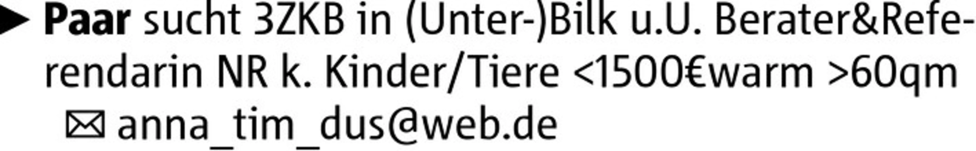 Paar sucht 3ZKB in (Unter-)Bilk u.U. Berater&Referendarin NR k. Kinder/Tiere <1500€warm >60qm anna_tim_dus@web.de