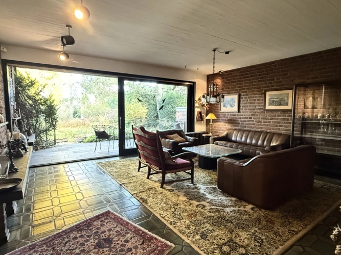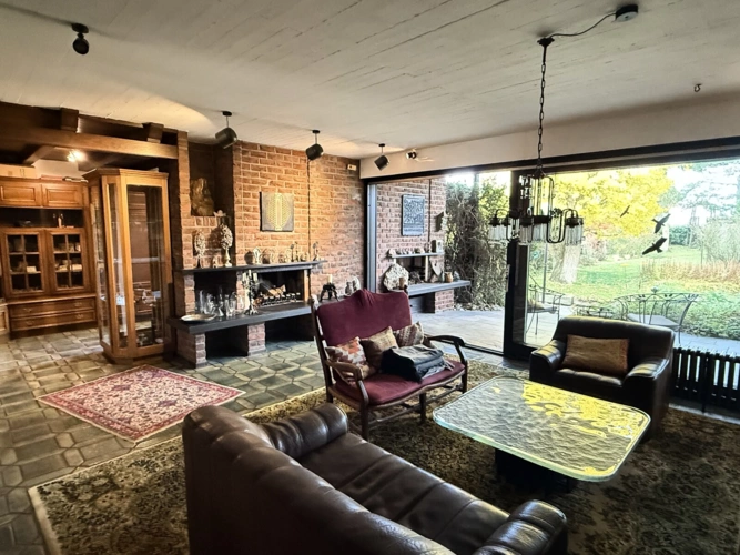 Das großzügige Esszimmer lässt sich bei Bedarf auch als Schlafzimmer umfunktionieren. Angrenzend befindet sich die Küche, die in den Wohnbereich mit Kamin und Leseecke übergeht. Vom Wohnbereich aus gelangen Sie auf die große, teilweise überdachte Terrasse, die einen herrlichen Blick auf den riesigen Garten bietet ein idealer Ort für entspannte Stunden im Freien. Das Erdgeschoss verfügt außerdem über ein Badezimmer mit Dusche und Wanne, ein zusätzliches Gäste-WC sowie einen Abstellraum.