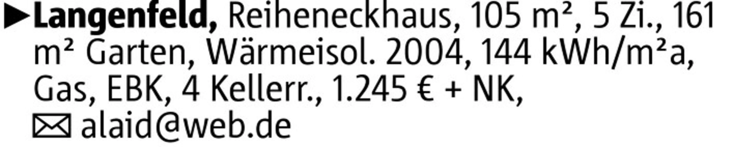 Langenfeld, Reiheneckhaus, 105 m², 5 Zi., 161 m² Garten, Wärmeisol. 2004, 144 kWh/m²a, Gas, EBK, 4 Kellerr., 1.245 € + NK, alaid@web.de