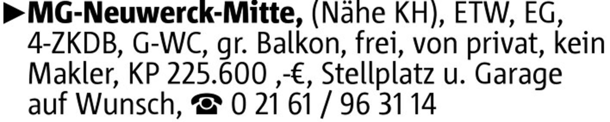 MG-Neuwerk-Mitte, (Nähe KH), ETW, EG, 4-ZKDB, G-WC, gr. Balkon, frei, von privat, kein Makler, KP 225.600 ,-€, Stellplatz u. Garage auf Wunsch, 0 21 61 / 96 31 14