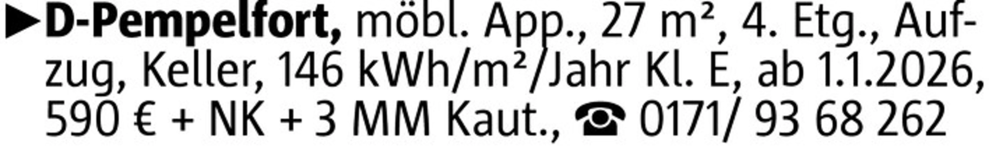 D-Pempelfort, möbl. App., 27 m², 4. Etg., Aufzug, Keller, 146 kWh/m²/Jahr Kl. E, ab 1.1.2026, 590 € + NK + 3 MM Kaut., 0171/ 93 68 262