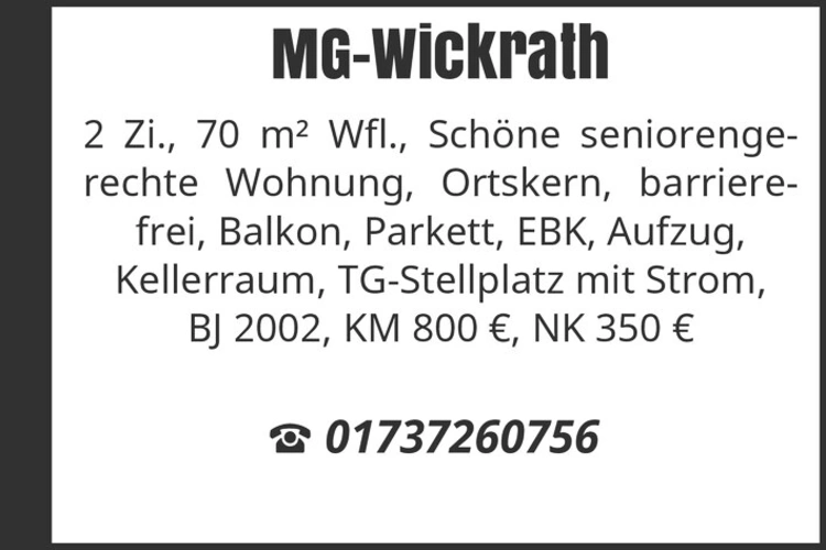 MG-Wickrath 2 Zi., 70 m² Wfl., Schöne seniorengerechte Wohnung, Ortskern, barrierefrei, Balkon, Parkett, EBK, Aufzug, Kellerraum, TG-Stellplatz mit Strom, BJ 2002, KM 800 €, NK 350 € 01737260756