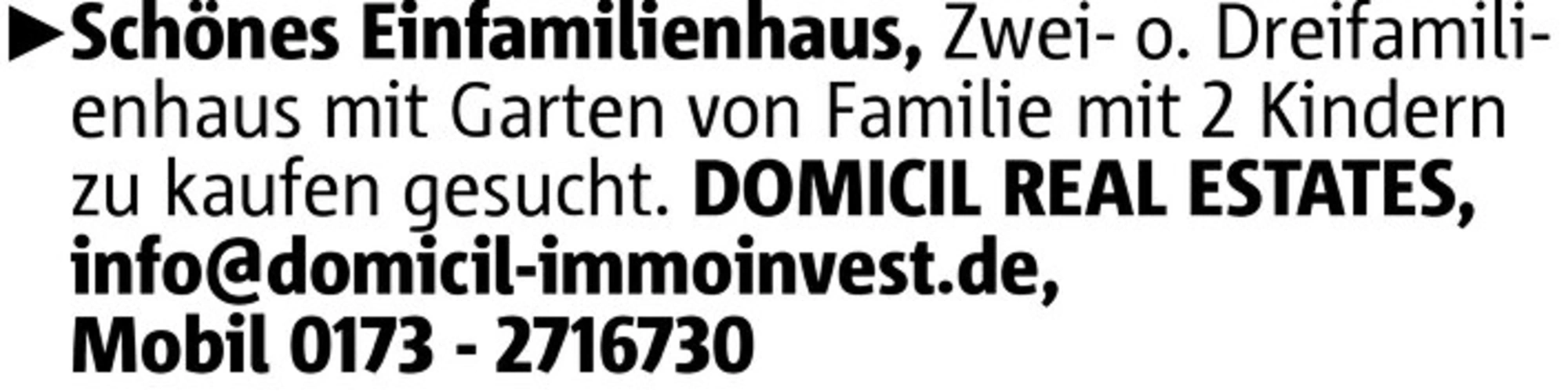 Schönes Einfamilienhaus, Zwei- o. Dreifamilienhaus mit Garten von Familie mit 2 Kindern zu kaufen gesucht. DOMICIL REAL ESTATES, info@domicil-immoinvest.de, Mobil 0173 - 2716730