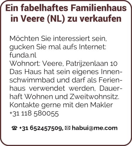 Ein fabelhaftes Familienhaus in Veere (NL) zu verkaufen Möchten Sie interessiert sein, gucken Sie mal aufs Internet: funda.nl Wohnort: Veere, Patrijzenlaan 10 Das Haus hat sein eigenes Innenschwimmbad und darf als Ferienhaus verwendet werden, Dauerhaft Wohnen und Zweitwohnsitz. Kontakte gerne mit den Makler +31 118 580055 +31 652457509, habui@me.com