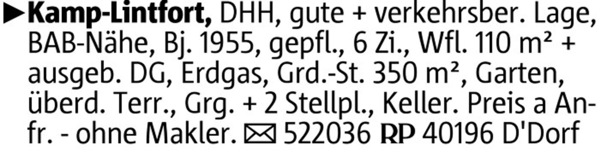 Kamp-Lintfort, DHH, gute + verkehrsber. Lage, BAB-Nähe, Bj. 1955, gepfl., 6 Zi., Wfl. 110 m² + ausgeb. DG, Erdgas, Grd.-St. 350 m², Garten, überd. Terr., Grg. + 2 Stellpl., Keller. Preis a Anfr. - ohne Makler. 522036 40196 D'Dorf