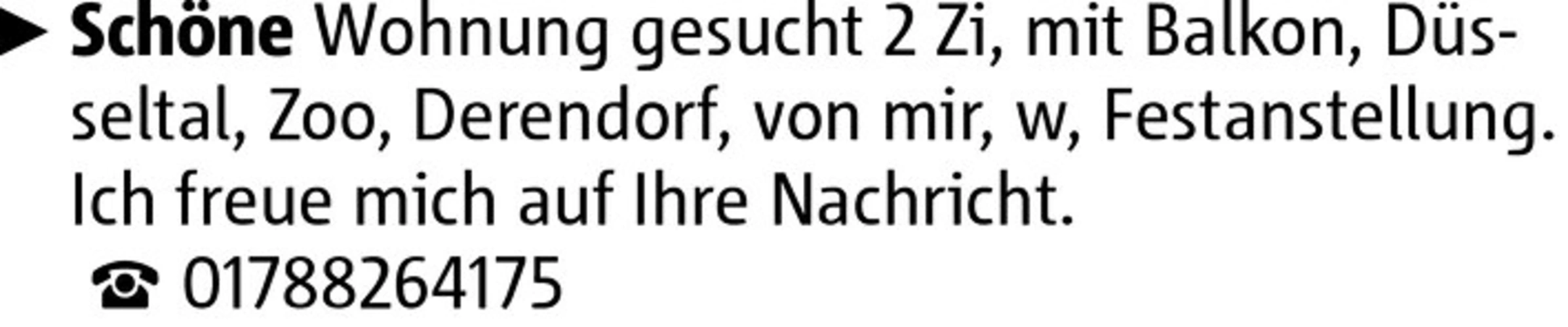 Schöne Wohnung gesucht 2 Zi, mit Balkon, Düsseltal, Zoo, Derendorf, von mir, w, Festanstellung. Ich freue mich auf Ihre Nachricht. 01788264175